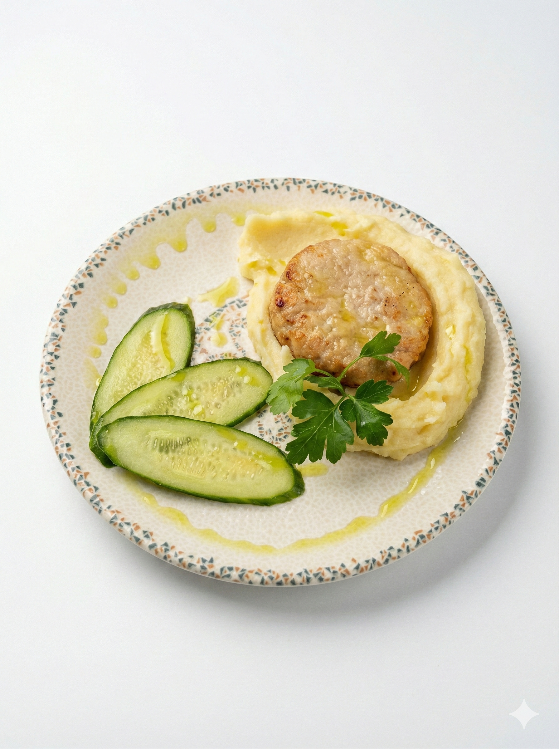 Куриная котлета с картофельным пюре или картофелем фри и огурцом